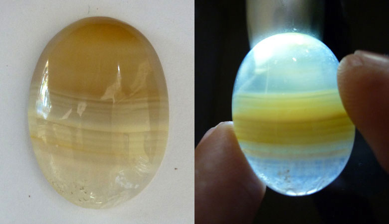Oval cabochon translucent Banded Agate - a little bit crystalized at one edge