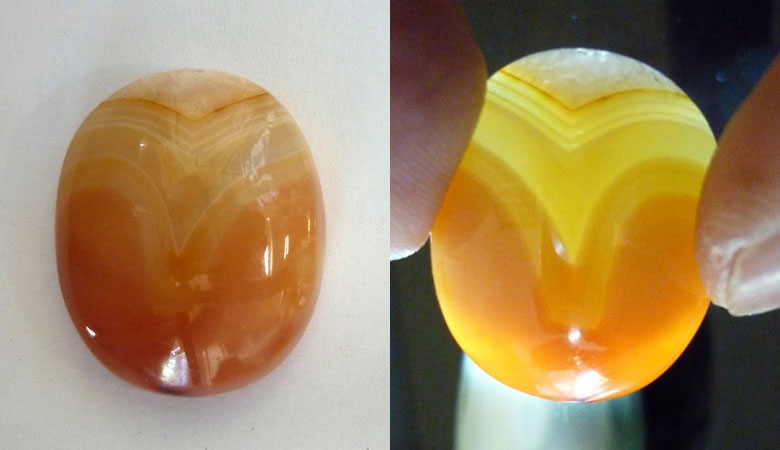 Oval cabochon translucent Banded Agate - a little bit crystalized at one edge
